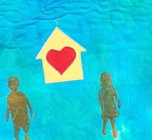 Het logo staat voor een veilige omgeving, enkele kinderen hebben die deur gehaald. In de voorgrond gestikte figuren van wachtende kinderen. De jongen en het meisje gaan naar het hek toegaan en om daar de zorg te vragen die zij nodig hebben.