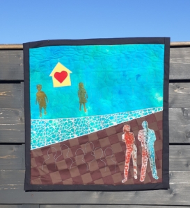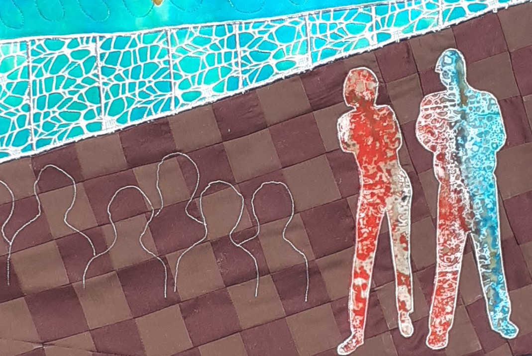 Het hek is de scheidslijn tussen hulpvraag en hulp die geboden kan worden. Ik maakte het met grof gaas en met de cordonsteek.