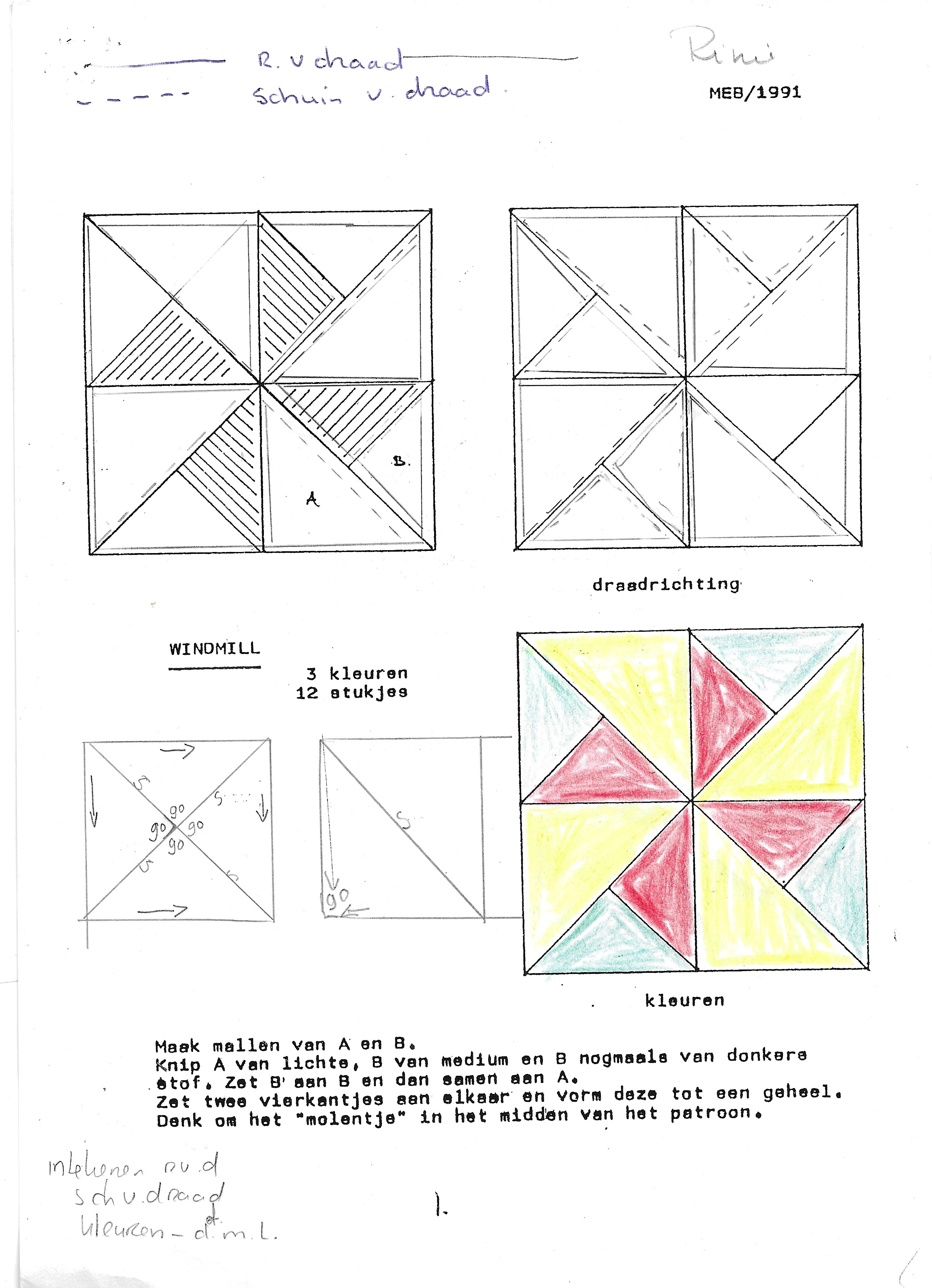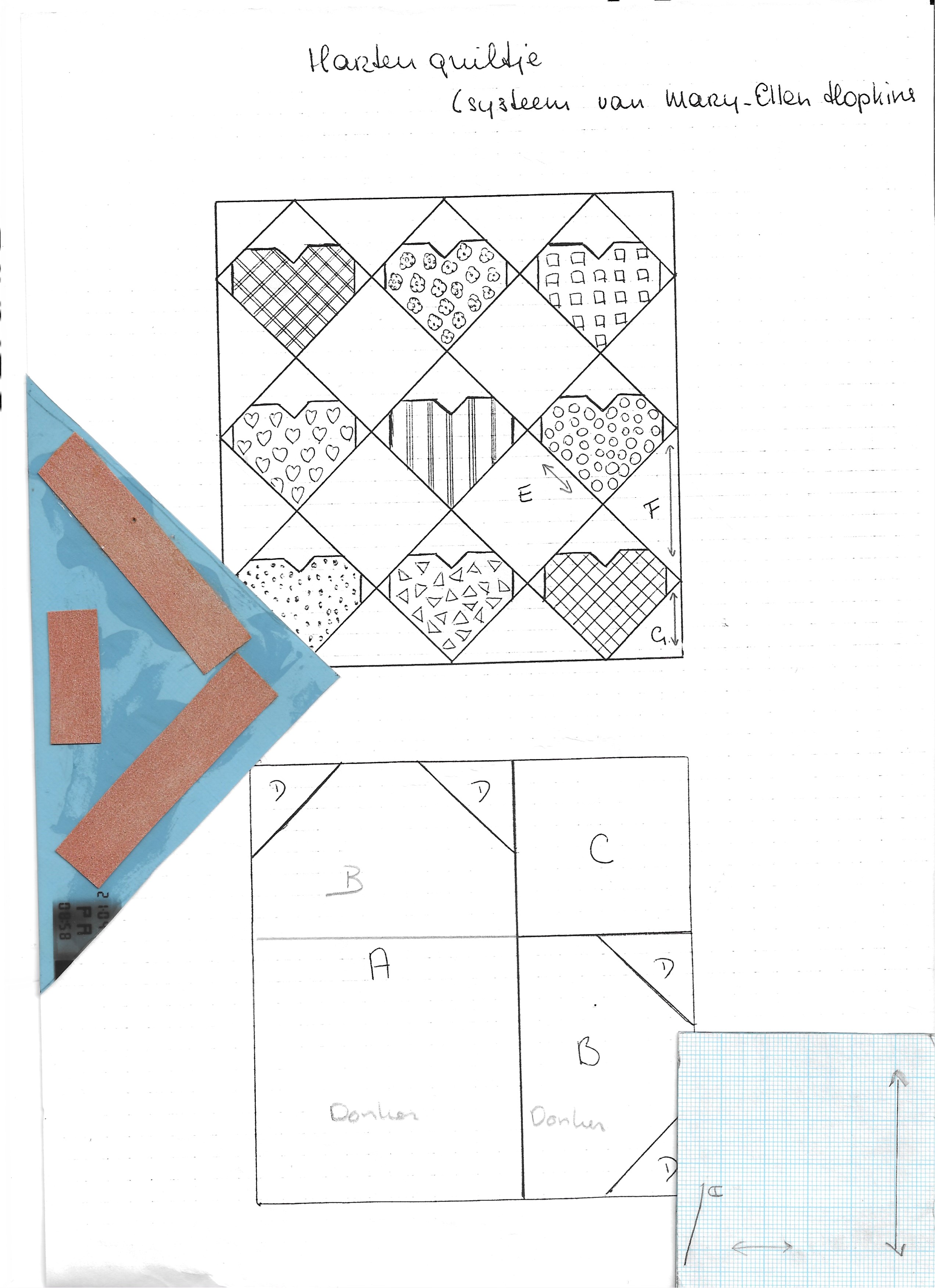 Omdat ik nogal van het bewaren, ben heb ik de eerste patroontjes en instructies over kleurenleer allemaal nog netjes in een klapper zitten. Het eerste werkstuk was een hartjes quilt. Helaas is het quiltje versleten maar het patroon en de beschrijving heb ik nog.