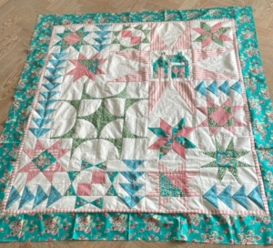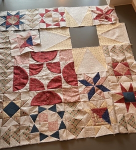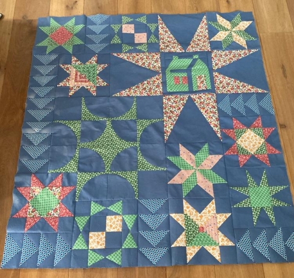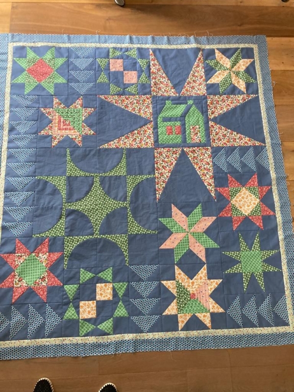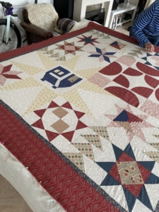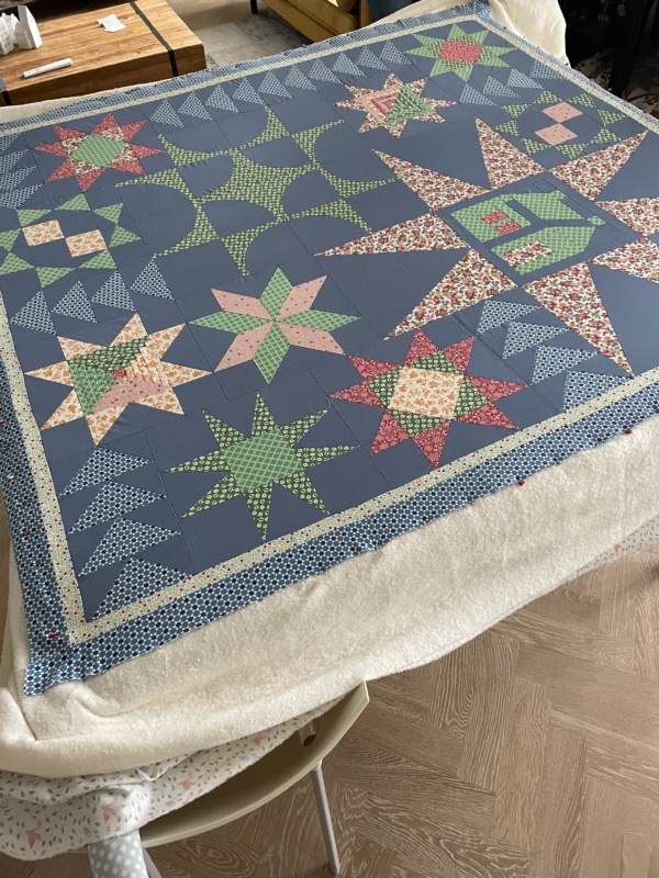 Nu in de zomer is het even te warm om door te quilten…binnenkort starten we weer op en dan wordt de top doorgequilt…we biezen hem af en maken natuurlijk een label…