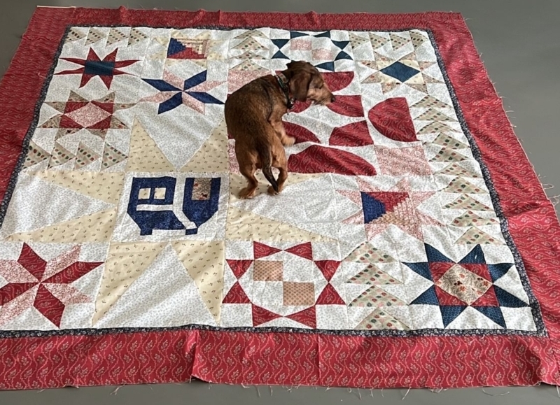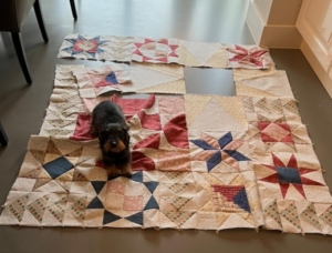 haha…ook bij de cursiste thuis geeft de hond goedkeuring :)… de quilt schiet al goed op…wat wordt hij mooi…