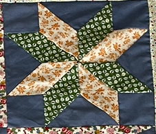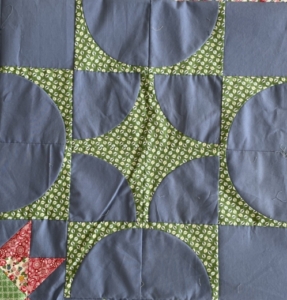 Wat ik zo leuk vind aan quilten is het effect wat de stoffen geven, hier zie je dat ook weer heel goed…bij twee van de drie is de ondergrond kleur de hoofdkleur gebleven maar bij de middelste zijn de kleuren gedraaid…dit omdat de quilt anders te wit en te vlak zou worden…je krijgt ook een ster maar een heel ander effect…bij de middelste vallen juist die ronde vormen zo goed op…