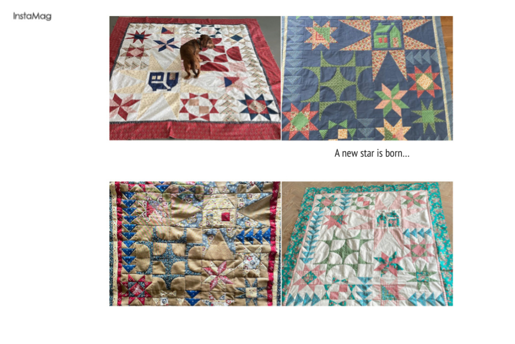 Alle vier zijn ze klaar.. drie grote quilttops voor op de bank en de eerste foto de quilt die 3x zo klein is…het is zo’n bijzonder gevoel dat er opeens 4 quilts zijn die jij bedacht hebt…en het verschil 8n kleuren zo mooi…