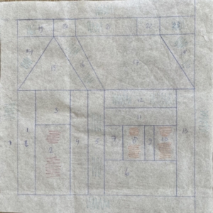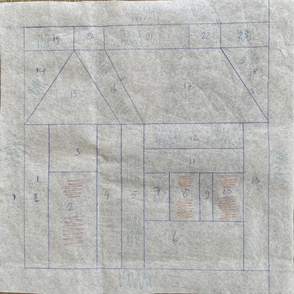 Ik teken het huis altijd eerst op H250 en dan plak ik het op de stof, leg het op de kop en zet het in elkaar…