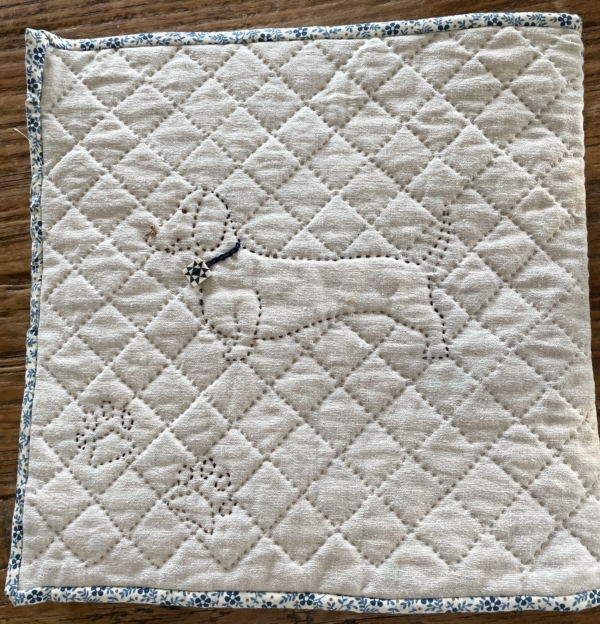 ja, doorquilten…dat leer je in mijn beleving niet meteen op je eerste quilt…we maken eerst een oefenblok…das handig dat wordt meteen de achterkant van het blokkenboek…we kiezen een patroon van een sjabloon uit wat aanspreekt..voor de ene quilster en mijzelf werd dat een teckel…tja, als je die hebt rondlopen dan wordt de keuze makkelijk…de andere wilde graag een hart…