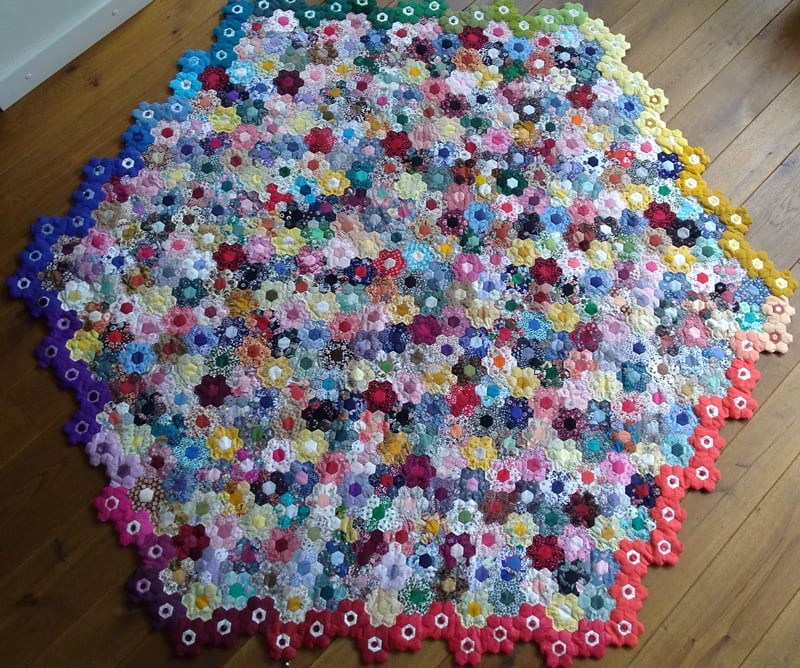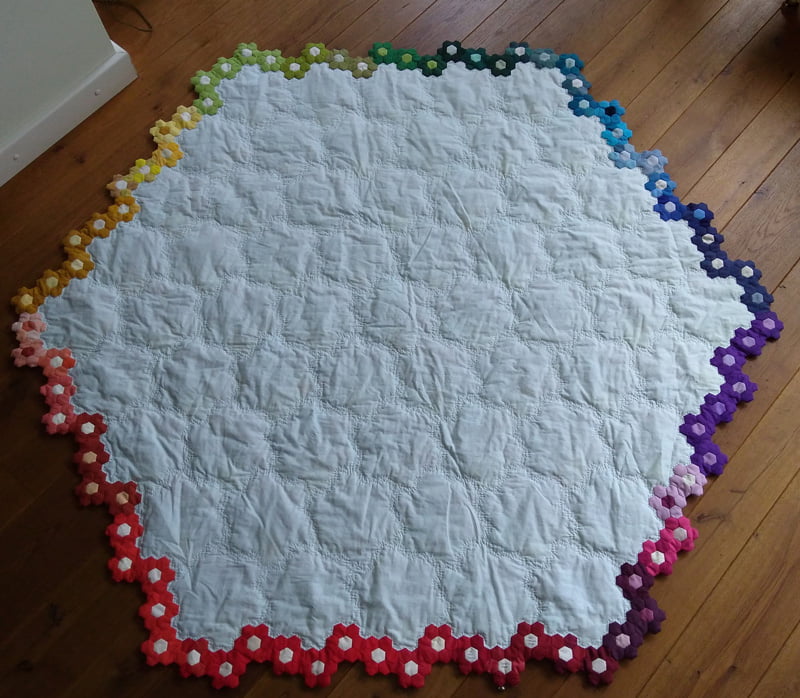 Er zitten aan de voorkant 511 hexagonbloemen en aan de achterkant in de rand nog eens 84 , totaal 595 bloemen maal 7 is 4165 hexagonnen, allemaal gemaakt van gekregen vierkantjes. Formaat is ongeveer 170 in doorsnede.