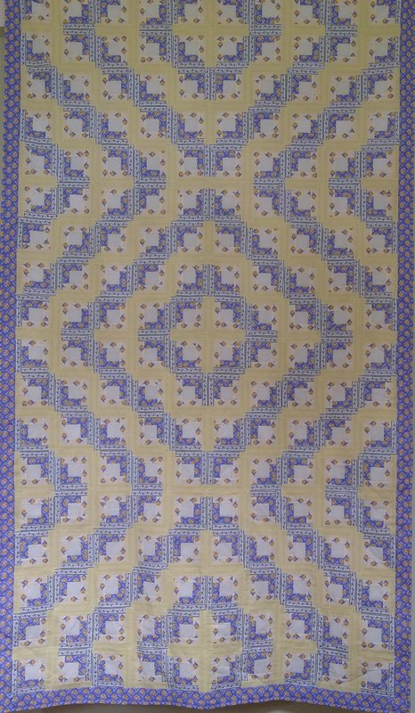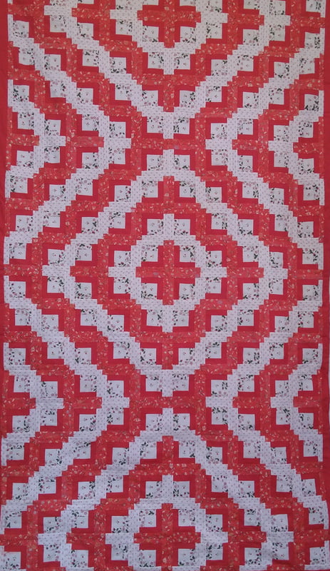 Mijn dubbelzijdige log cabin is af : de ene kant rood met wit, de andere geel met blauw, 130 x 225 en bedoeld als tafelkleed in de werkkamer, geknoopt aan elkaar gezet.