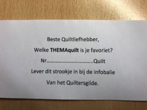 Wat zou het leuk zijn als bezoekers dit briefje invullen en zo hun favoriete Themaquilt kiezen. Het briefje kan worden ingeleverd bij de infostand van het Quiltersgilde.