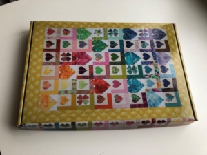 Voor nieuwe leden die zich aanmelden bij de infostand is er weer een leuk welkomstpakket samen gesteld, verpakt in een prachtige doos die bedrukt is met een hartenquilt. Aan de hartenquilt hebben diverse leden gewerkt door een blok in te leveren voor de overstromingen in Limburg. Misschien herken je je blok wel dat je gemaakt hebt.