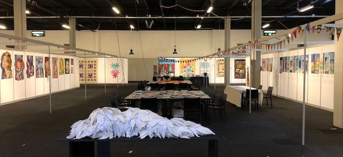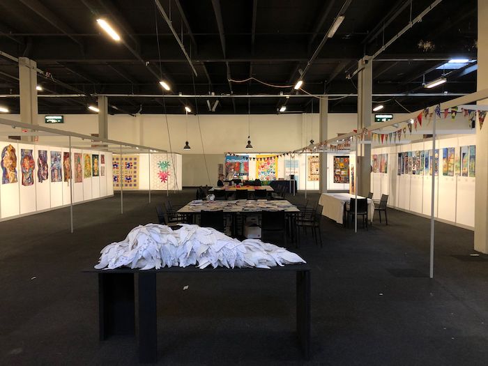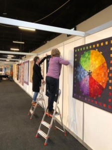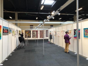 Wat is er hard gewerkt de afgelopen 2 dagen om alle quilts op te hangen en de infostand in te richten. Maar er is ook geweldig veel te zien deze keer. De thema quilts ‘Langs de Lijn’ van de Algemene Tentoonstelling, de Orient Express van SAQA, het vleugelbeeld van Fleur van de Berg. En verder EQA ‘Treads without borders’ en natuurlijk niet te vergeten de inzendingen van de artquilt wedstrijd! De jury heeft gisteren na rijp beraad de 3 prijswinnaars uitgekozen. Zo, wat een moeilijke taak is dat! Petje af voor Rita Dijkstra, Harm Harmsen en Marian Ruitenberg.
