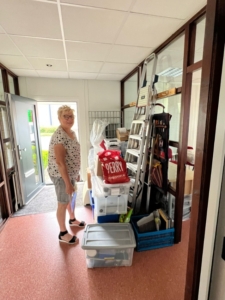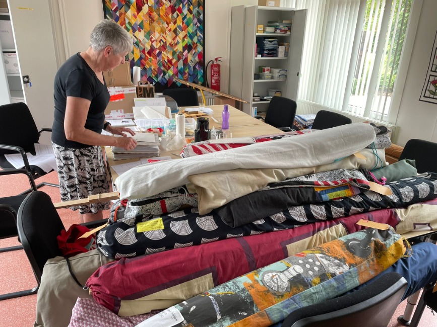 Afgelopen weekend is de tentoonstellingscommissie druk geweest met het innemen van quilts, het klaar zetten van materialen en de boeken voor de bibliotheek. Maandagochtend 9.00 uur gaan de deuren van Hart van Holland voor ons en de standbouwer open. Vanaf woensdag zijn we dan klaar om de bezoekers te ontvangen. We hebben drie hallen tot onze beschikking:
