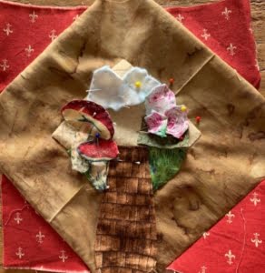 Van drie Alice plaatjes één Alice gemaakt…het moest tenslotte erop lijken dat ze naar beneden valt…ik heb de lijnen nog wat benadrukt met donkerbruin garen zodat er nog meer diepte in het blok kwam…