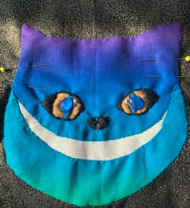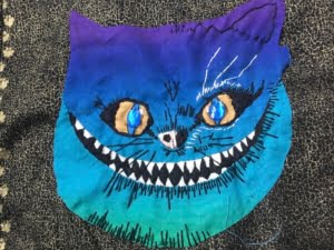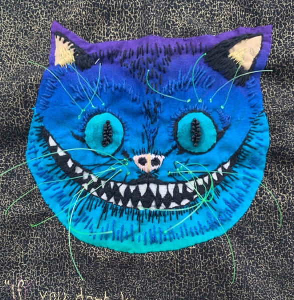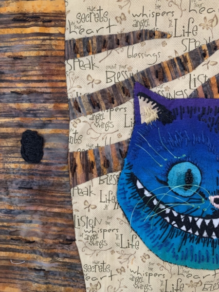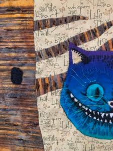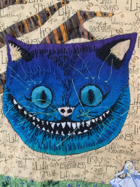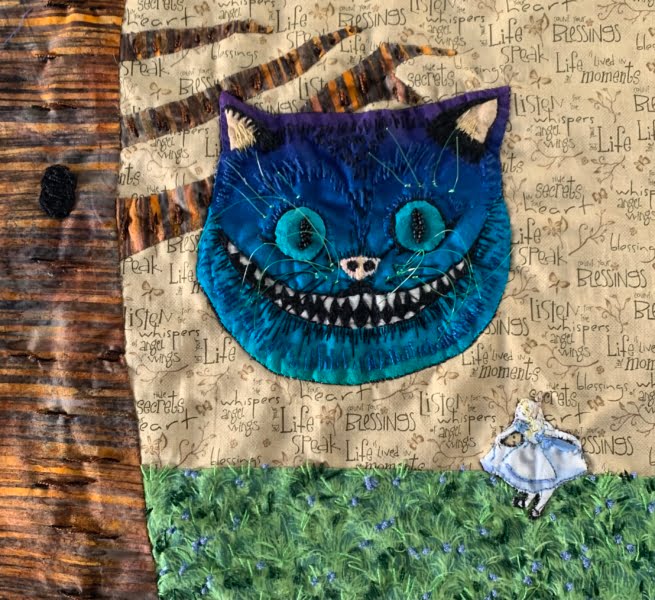 In het verhaal zit de kat in de boom, vanuit de boom praat hij met Alice…op zoek naar stof…ik heb stof uit gekozen met tekst. Dan heeft de kat genoeg te zeggen…Mijn inziens komt de kop nu ook beter uit…
