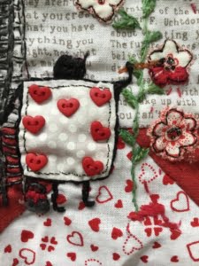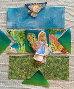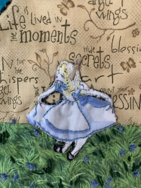 Alice wordt toegevoegd… alle bloemetjes geborduurd…wat sprietjes van het gras, om er meer beleving in te krijgen… het wordt al beter…