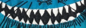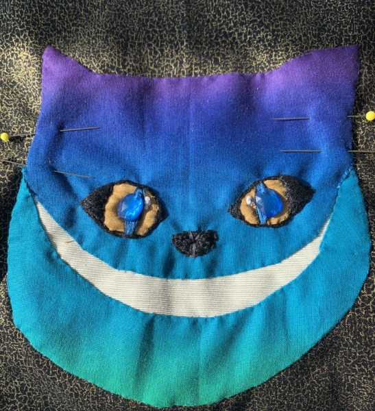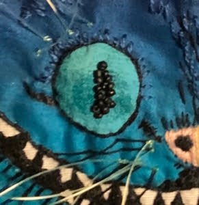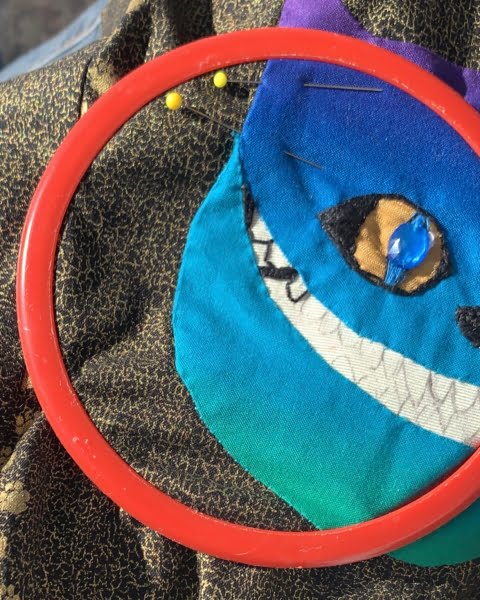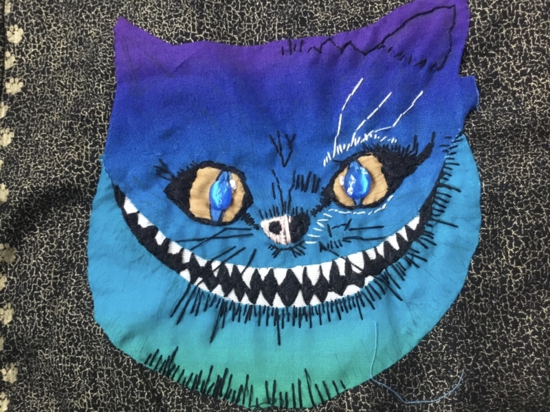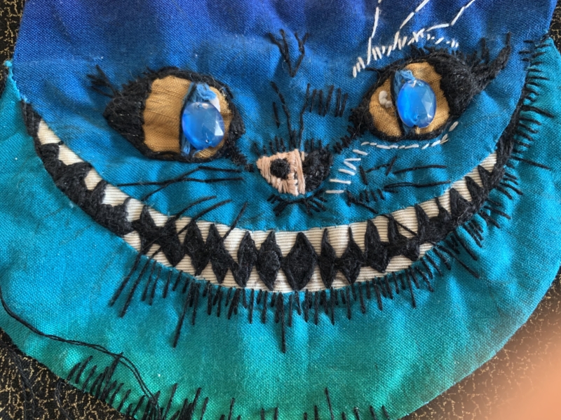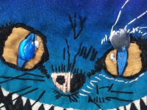 De ogen heb ik eerste gemaakt, erop geborduurd en erna met glimmende steentjes, nu borduren…tand voor tand… tot er een enorme grijns ontstaat…