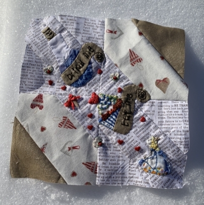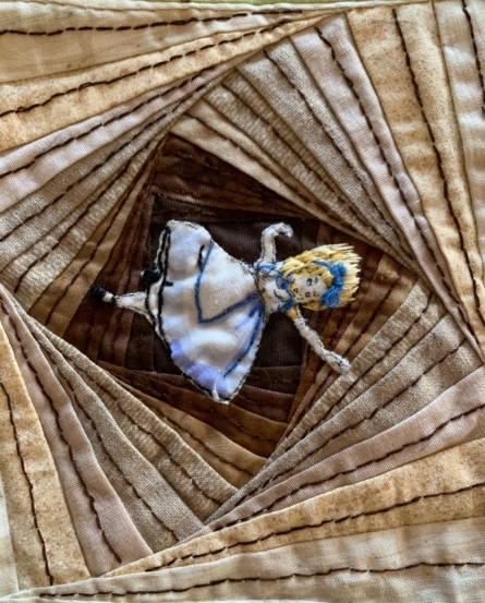 Van drie Alice plaatjes één Alice gemaakt…het moest tenslotte erop lijken dat ze naar beneden valt…ik heb de lijnen nog wat benadrukt met donkerbruin garen zodat er nog meer diepte in het blok kwam…