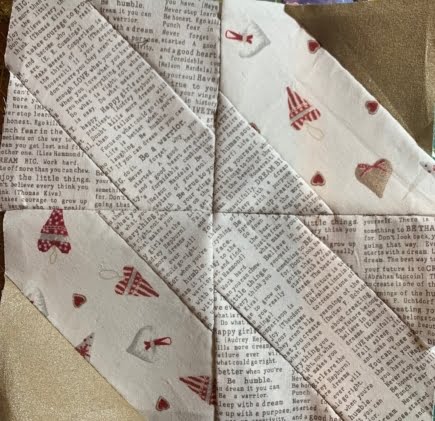Eerst de achtergrond stof…ik wilde stof alsof het een bladzijde uit een boek was…nergens te vinden…wat rondgevraagd en gelukkig had een quiltvriendin nog een stukje…wat super…nu kan het worden zoals ik graag wil…