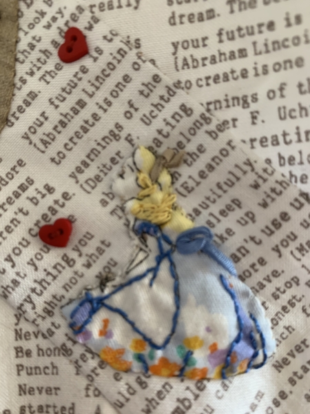 Alice haar haren omhoog geborduurd…tja, Alice daar val je dan…down, down, down…