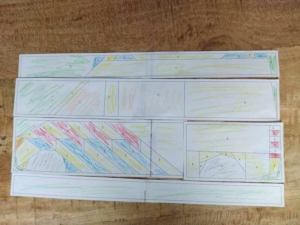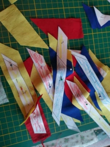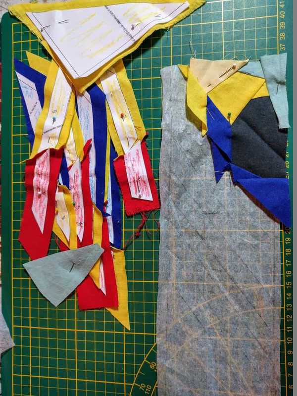 3. Maakte met de hand stroken met de geel/blauwe en geel/rode stukjes. Wel opletten dat je in spiegel werkt.
