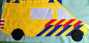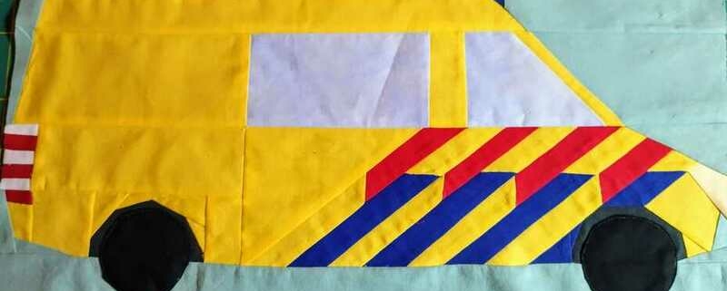 Als mijn kleinkinderen 4 jaar worden krijgen ze een dekenquilt van me. Ik zoek iets wat bij dit kind past. Ook is er altijd op quiltgebied een nieuw aspect voor me. De grootste uitdaging tot nu toe wordt de vervoersquilt voor Ivan. Hij vindt auto’s (met zwaailichten) geweldig en houdt van de kleur groen. Ik wilde nu voertuigen met ronde wielen én duidelijk herkenbare Nederlandse hulpverleningsvoertuigen.