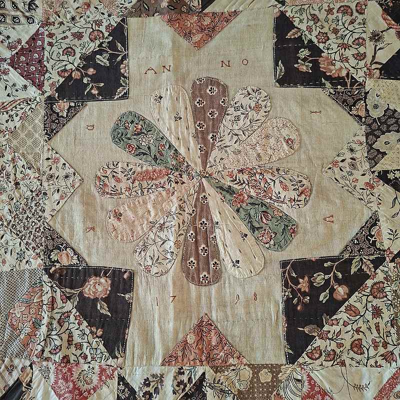 In het midden zie je ook dat zo netjes is genaaid dat het lijkt alsof er een naaimachine is gebruikt. De eerste naaimachines verschenen (volgens wikipedia) in 1830. Dus dat kan niet, tenzij de quilt later is hersteld? Er zitten vast ook echte sitsen in.