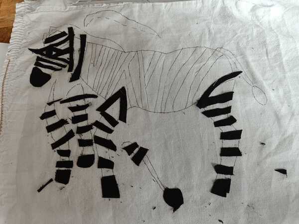 De zebra was de grootste uitdaging. De zwarte strepen heb ik eerst op een witte ondergrond genaaid. Wel in de outline van de zebra. Daarna pas de hele zebra op seam a seam geplakt, uitgeknipt en opgenaaid. Uiteindelijk waren de 15 afbeeldingen klaar.
