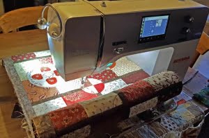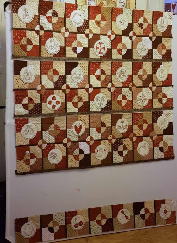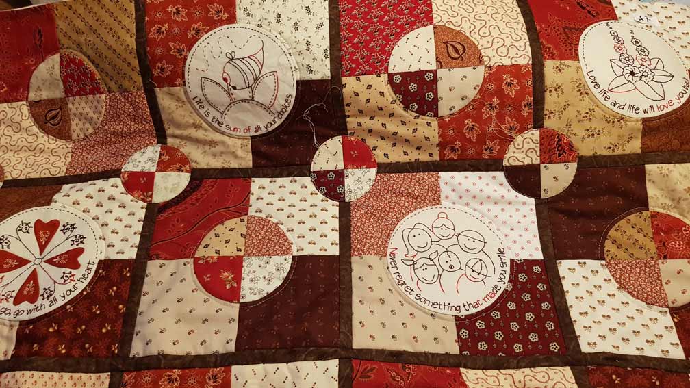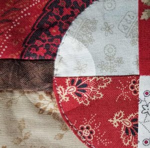 Het stadium waar ik nu in zit is het aan elkaar zetten van de quilt-as-you-go rijen met de tussenbies. En op de kruispunten die bij die rijen ontstaan wordt dan weer een cirkel geappliqueerd. Het idee is dat je die cirkel met de naaimachine appliqueert en ‘m zo gelijk doorquilt. Iets in die omschrijving riep bij mij het beeld op van een lekker tempo en eenvoud. Ik wil niet zeggen heel makkelijk, maar het was ook niet iets waar ik mij zorgen over maakte. Ik quilt soepeltjes op de naaimachine, draai mijn hand niet om voor ronde vormen en veren. Zo’n cirkeltje vastzetten doe je dan ook gewoon even, toch?