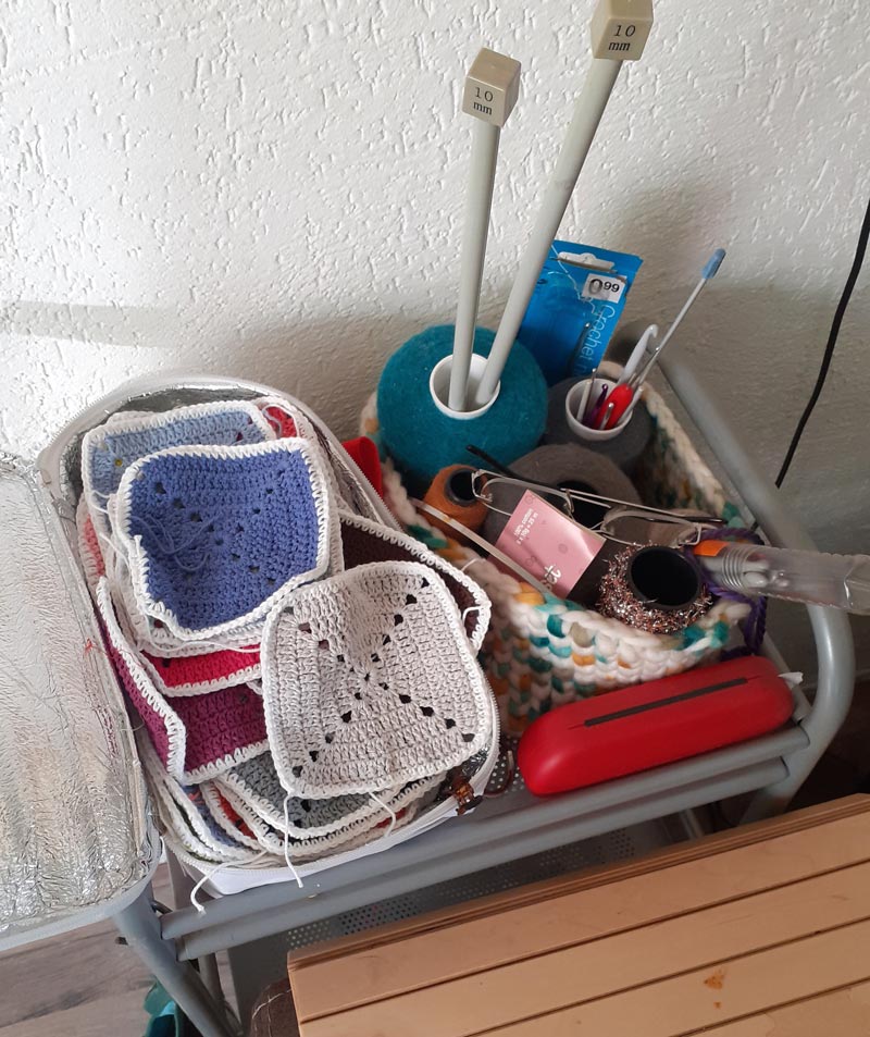 Als zij achter haar machine werkt doet ze dat in een kleinere kamer waar al haar materialen voorhanden zijn en in geval van nood is er nog een magazijn ontstaan in de garage.