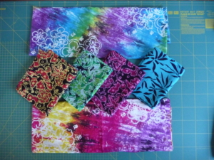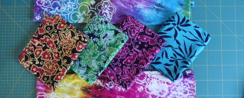 In die tijd had ik ook het stofverven ontdekt dus had inmiddels een la vol met prachtig kleurverloop aan zelf geverfde stoffen. Deze wil ik wel gaan gebruiken in combinatie met de batiks.