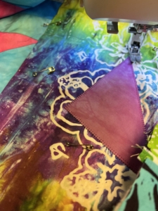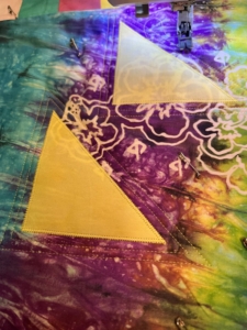 De driehoeken op de batik geappliqueerd met de festonsteek.