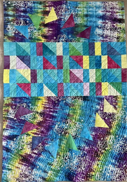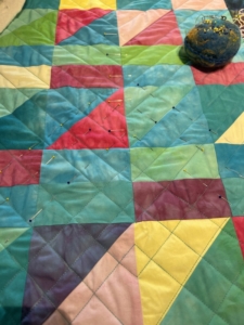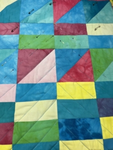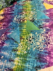 De batik waar de driehoeken op waren geappliqueerd daar heb ik in een slingerende lijnen om de driehoeken en tussen door gequilt. Om de driehoeken heb ik rechte lijnen gequilt.