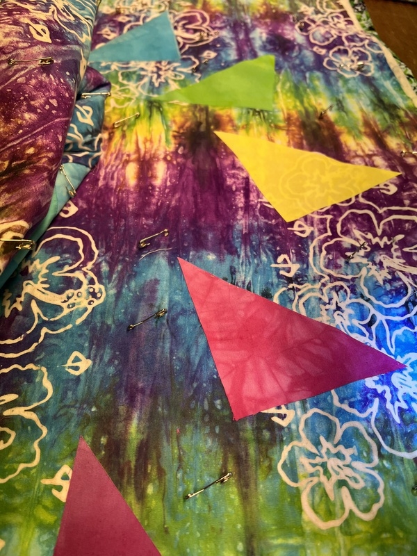 De driehoeken op de batik geappliqueerd met de festonsteek.