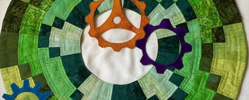 Anneke vertelt dat de vorm van haar quilt voortkomt uit een eerder project. “De groene kleur symboliseert de cyclus van de natuur, en de ronde vormen zijn een reflectie van de beweging die daarbij hoort. Ook de radertjes in het ontwerp geven een dynamische beweging weer, wat het idee van een cyclus versterkt. Het quiltje is volledig met de machine gemaakt.”