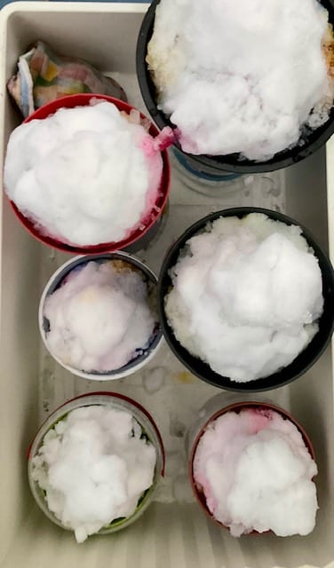 Ik heb deze keer met andere kleuren geverfd. Weet niet welke kleur en hoeveel verf in welke bloempot gaat. Ik schrijf het niet op, omdat ik de 2e keer toch niet hetzelfde resultaat krijg. De kleuren mengen zich als de sneeuw smelt en hierdoor krijg je nieuwe kleuren.