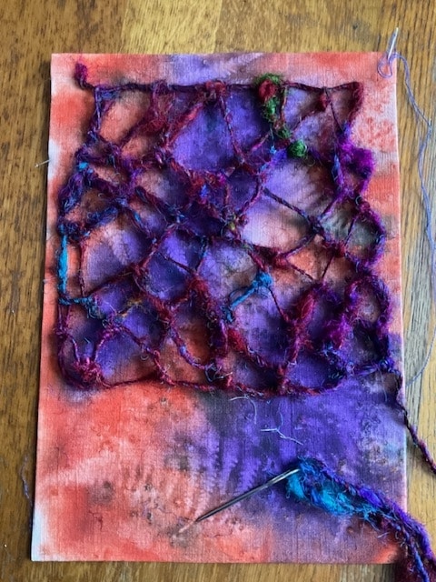 Fijn dat ik het dunne katoenen breigaren in hetzelfde verfbad heb gedaan, dat is nu geschikt voor de borduursteekjes.