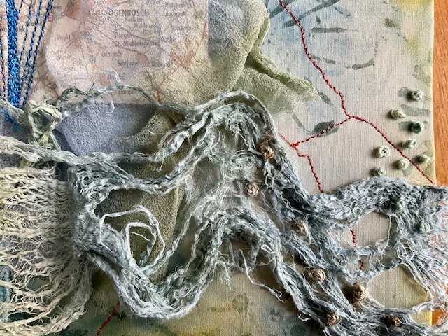 Als het geheel op de ondergrond ligt, ga ik het borduren. Voornamelijk met een witte draad in de hoop dat het straks allemaal een kleurtje krijgt.