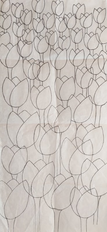 De tekening van de tulpen heb ik overgenomen op vlieseline H250. Een vrij stevig plakvlies. Dit heb ik op de tussenvulling achter het katoen van de theedoek gestreken.