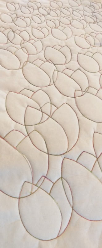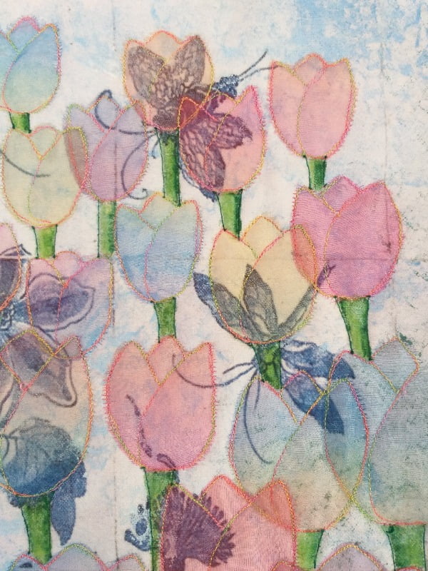 Elke tulp is vervolgens vanaf de achterkant free motion vast gestikt (upside down appliqué) . Je speldt hiervoor een royaal lapje op de voorkant op de plaats waar de tulp moet komen en vanaf de achterkant stik je het patroon over de getekende lijn. Dan aan de voorkant de overtollige stof wegknippen .
