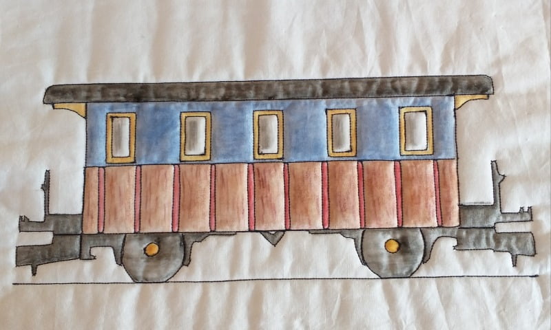 De lijnen van de wagon heb ik met een donkergrijs garen en een klein steekje doorgestikt waarna het papier kon worden weggescheurd.