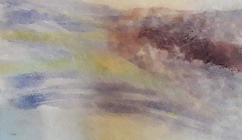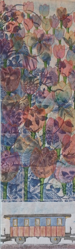 Ook de wagon heb ik daarna met Inktense potloden ingekleurd. De lucht is met een vochtige spons met sterk verdunde acrylverf lichtblauw gemaakt.
