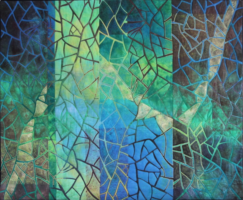 Deze quilt is de eerste grote quilt die ik heb gemaakt met de positief negatief methode. Nadat ik eerst een experimentele quilt had gemaakt met zeewierachtige blokken. Ik heb gebruik gemaakt van 3 lappen van Heide Stoll Weber in groen en blauw tinten, een hele lichte lap, een hele donkere en eentje ertussen in. Achteraf was dit een hele gelukkige keuze. Ik was zelf ook verbaasd door het effect. Tijdens het maken bedacht ik dat ik de applicaties ook deels op de kop kon leggen, zodat nog minder duidelijk werd waar deze vandaan kwamen. Nadat alles was vast gestreken en genaaid vond ik dat er warme accenten misten. Ik heb toen met schilderstape rechthoeken geplakt op de quilt en daarbinnen met gele/rode textielverf met een natuurspons kleur aangebracht op de rechthoeken. Wel spannend, want de quilt was al goed en het was niet terug te draaien. Maar het resultaat was goed, niet te opvallend en toch een warme touch. Om dat verder te versterken heb ik de randen van de applicaties met een cordonsteek met rood/geel garen geaccentueerd. Later heb ik nog een soort slinger van gele/goudkleurige verf gemaakt dat als eyecatcher moest fungeren.