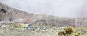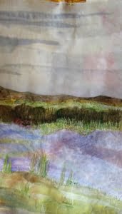 Op het gele achtergrond strijk ik geverfde vliesofix om een summiere kleur groen met wat goud aan te brengen. Dit gedeelte wordt verticaal doorgestikt met een extra strook lutradur en organza. Beide stoffen zitten alleen in het midden vast en komen dus iets omhoog.