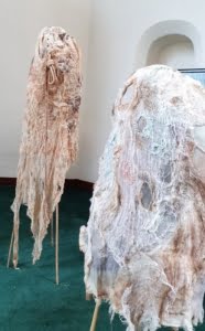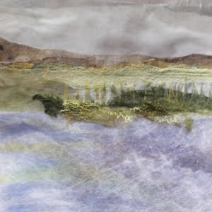 Jo is geboren in Friesland en woont nu in Neede (Achterhoek) en beide streken inspireren haar. Die verbondenheid is te zien in de kleidialogen. Prachtig om de zware zeeklei van Friesland te combineren met textiel, en dat dan zo doorzichtig/inzichtelijk te laten zien.