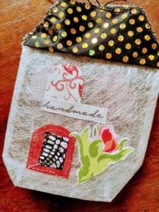 Je maakt een Art kaart van 15 x 15 cm. Je verwerkt daarin textiel, draden, papier….. noem het maar op. Sommige mensen geven de kaart een harde binnenkant. Sommigen doen dat juist niet. Je kaart krijgt een achterkant. Op deze achterkant komt het adres van diegene waar de kaart naar toe gaat en de postzegel. Je kunt de kaart zo in de brievenbus gooien, maar vaak wordt de kaart in een cellofaan zakje gestopt om smerig worden tegen te gaan of te voorkomen dat kralen, ofzo er afvallen. Om de postzegel te kunnen afstempelen moet er dan wel een extra gat rondom de postzegel uitgespaard worden. Want juist een afgestempelde postzegel maakt de kaart tot een echte kaart. Ik gebruik vaak lutradur als drager voor de kaart. Dus de tussenlaag, wat in een quilt de batting is. Dit maakt de kaart licht (goed voor 1 postzegel) en stevig.