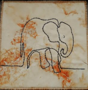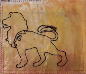 Ontvangen mocht ik de olifant van Gerrie, op een lapje bewerkt met roest. Ik heb gemaakt een leeuw in 1 lijn op wax papier. Hiervoor moest ik de gaatjes voorprikken. De draad is opgenaaid.