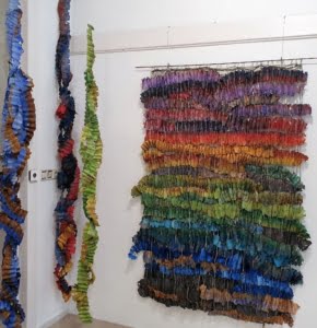 Op dit moment is werk van Jo te zien bij Hawar waar de textielgroep Zoo-Tex laat zien hoe zij Friesland ervaren. Hier hangt weer een heel ander werk van haar, geweven kleurrijke stroken.