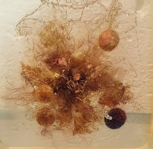 Voor de achtergrond zoek ik naar mogelijkheden. Jill Kertulla beschrijft hoe zij de achtergrond bewerkt door met laagjes op elkaar te stikken en dan door te knippen/snijden. Dit past wel bij de bloembladeren en dit ga ik dus toepassen voor de rechterzijkant . Een laag groene stof, repen koperen stof met glimmer, een aantal stroken lutradur en groene organza, en dan door de lagen snijden. Dit plaats ik naast de bloem. De bloem komt er nog een klein stukje overheen.
