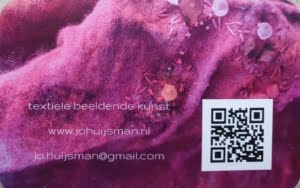 Mijn eerste kennismaken met Artquilten kwam door een toevallig contact met iemand uit de Dutch Fibermail groep. Zij experimenteren met materialen en technieken en doen dat in het klein. Vijftien bij vijftien centimeter zijn de meeste kaarten die de groepsleden voor elkaar maken en naar elkaar toesturen. Door informatie uit te wisselen ben ik toen lid geworden van deze groep. Dat is minstens 10 jaar geleden !