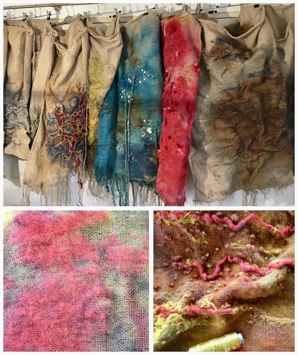 Cas Holmes, een engelse quiltster maakt prachtige werkstukken van gevonden kleding. Op haar eigen manier maakt zij daar landschappen en andere taferelen van.