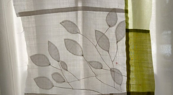 Ik ben nu zelf bezig met een bojagi met borduursels en applicaties van transparante ramee (zie foto) en zijde organza.